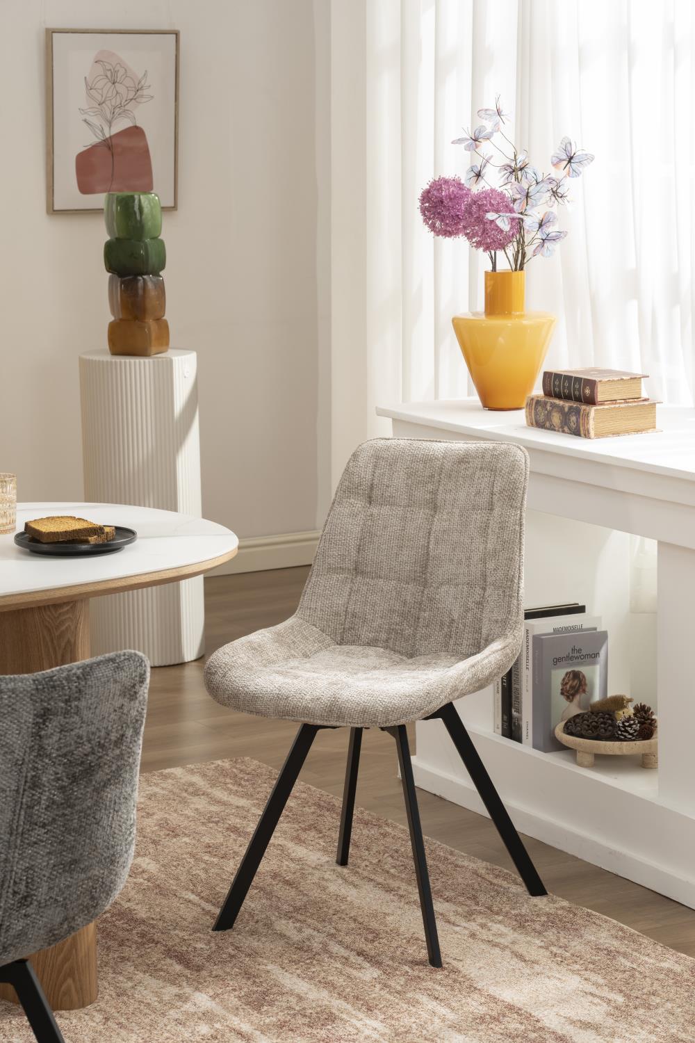 Cette chaise de salle à manger pivotante en tissu allie confort et élégance. Son assise et son dossier légèrement enveloppants, associés à un rembourrage épais, offrent un excellent confort au quotidien. Son revêtement en tissu résistant assure une finition soignée, tandis que ses pieds en métal robustes apportent stabilité et une touche design moderne. Idéale pour sublimer une salle à manger chaleureuse et élégante.