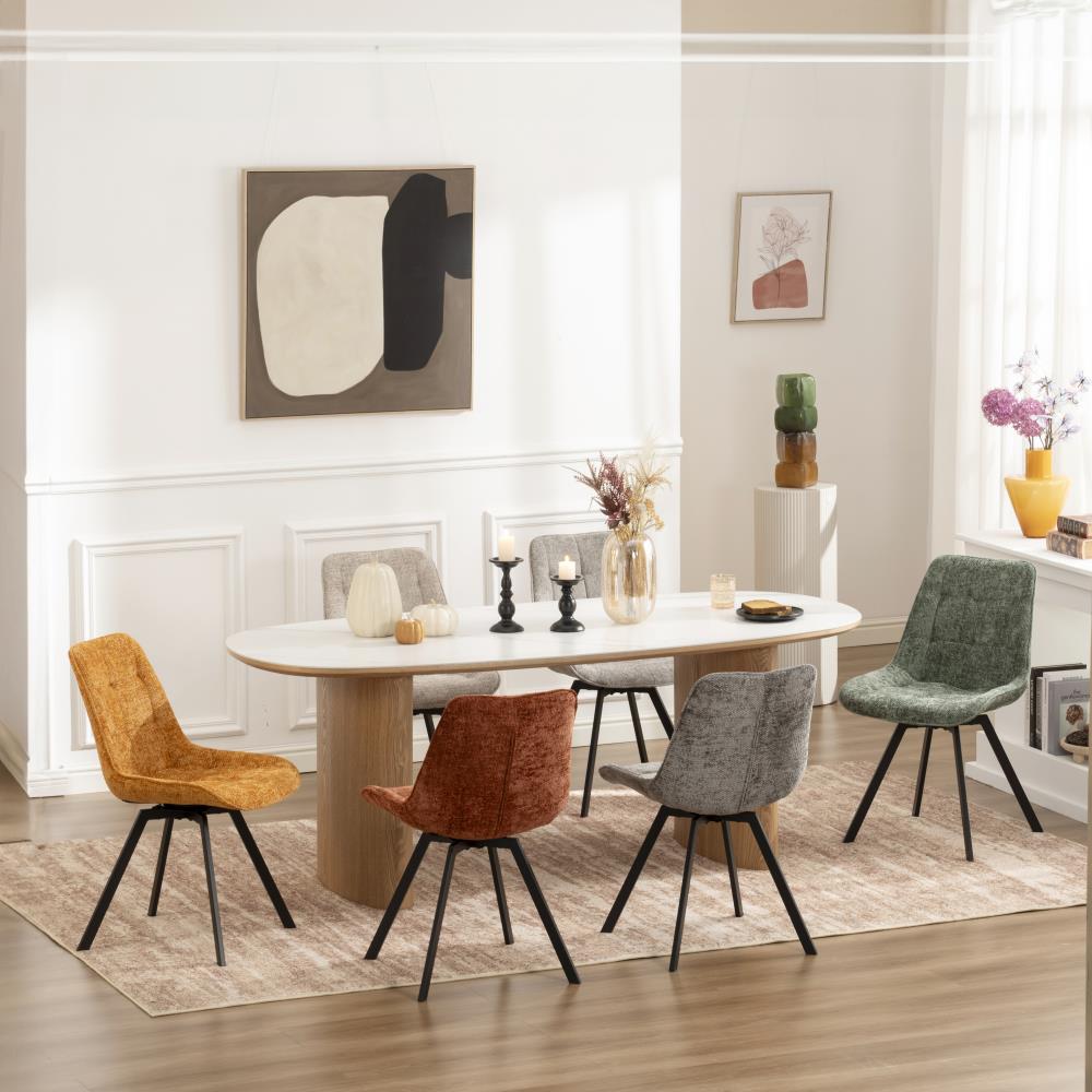 Cette chaise de salle à manger pivotante en tissu allie confort et élégance. Son assise et son dossier légèrement enveloppants, associés à un rembourrage épais, offrent un excellent confort au quotidien. Son revêtement en tissu résistant assure une finition soignée, tandis que ses pieds en métal robustes apportent stabilité et une touche design moderne. Idéale pour sublimer une salle à manger chaleureuse et élégante.